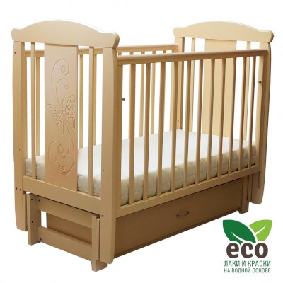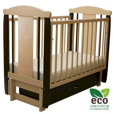 Кроватка "Соня 05" имеет механизм качания продольный маятник. Механизм качания фиксируется. Возможен вариант кровати с ящиком.