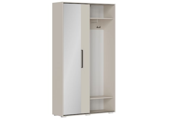 Разделение на секции: Одна часть прихожей включает две одинаковые секции с полками, закрытые створками. В каждой секции предусмотрено по две съёмные полки, что позволяет настраивать пространство под ваши нужды. Открывание створок осуществляется за выступ, что делает использование шкафа более удобным.