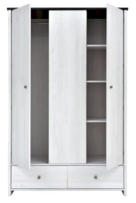 Шкаф разделен на 3 отделения. С левой стороны – за распашными дверями расположено отделение со стационарной штангой для одежды. С правой стороны – за распашной дверью отделение с полками. В нижней части шкафа 2 глубоких выдвижных ящика на металлических роликовых направляющих.